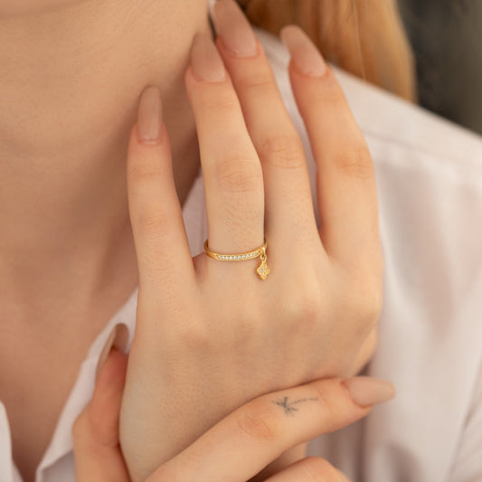 925 Ayar Gümüş Yarım Pave Sarkan Yonca Yüzük