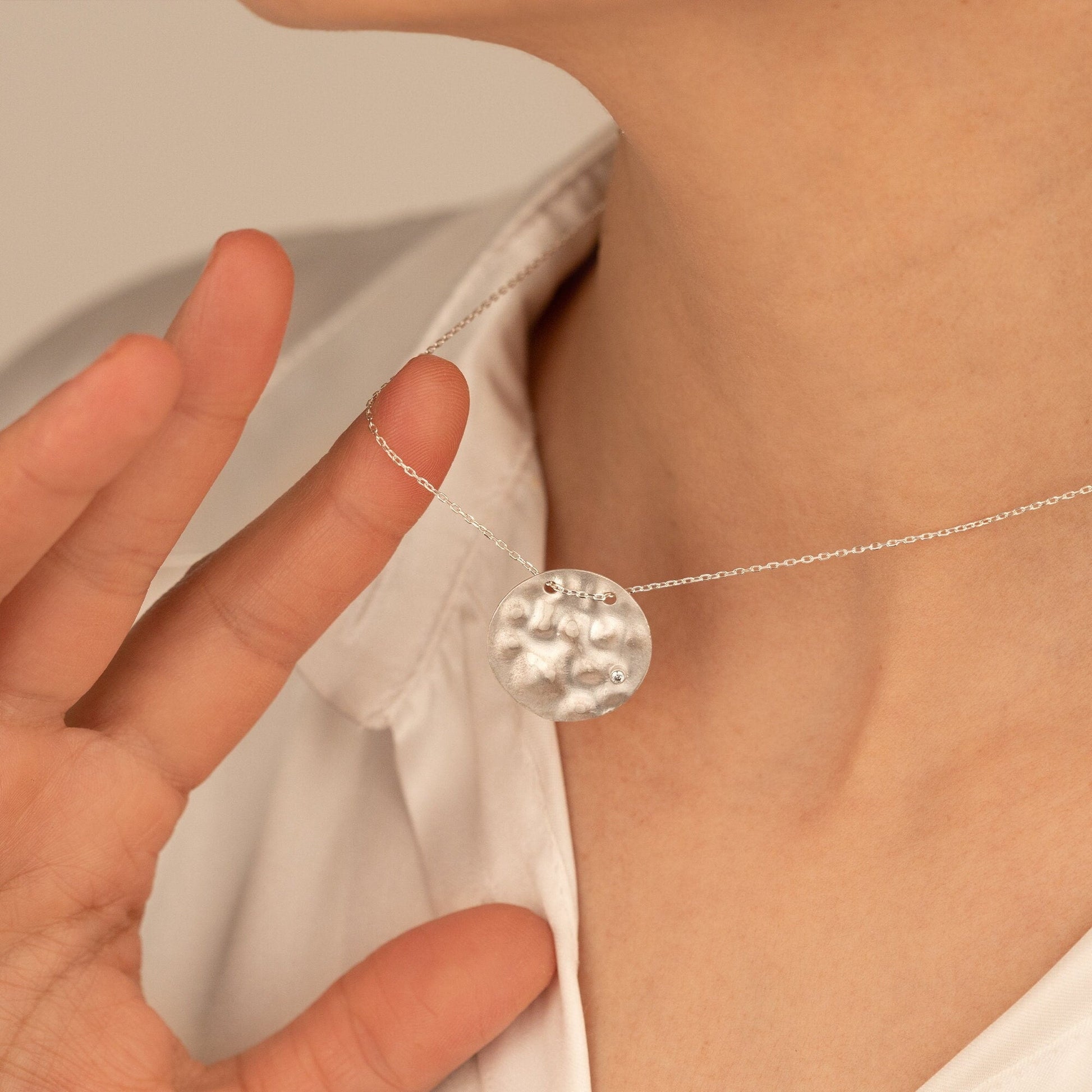 Crafted from 925 sterling silver, this hammered disc necklace brings a touch of elegance to any outfit. The unique texture of the disc adds a subtle shine, making it the perfect accessory for any occasion. Made with expert craftsmanship, this necklace is a timeless piece that will elevate your style.